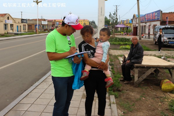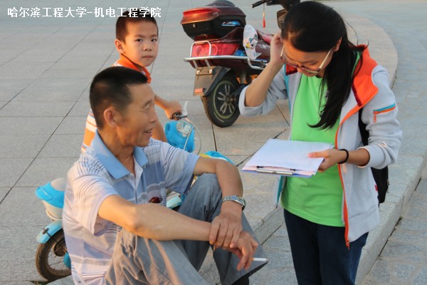由于漠河县地广人稀,队员们吸取上午的教训,选择了人数较为集中的晚上7时在北行广场展开调查。为保证调研有序、快速地进行,实践队伍首先按预先安排分成7个小组进行调查。调研中,村民们大都十分配合地完成了调查问卷。有些村民无法自行完成问卷,队员们就耐心地向他们讲解并帮助他们完成问卷调查。
