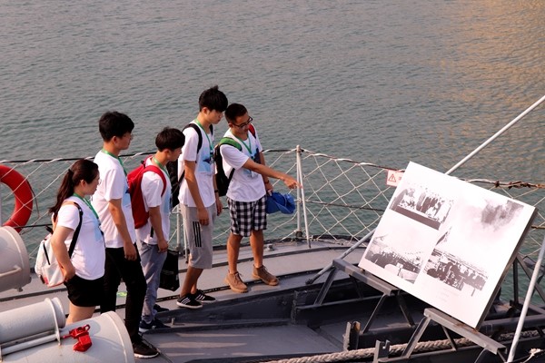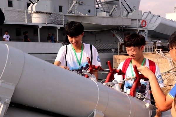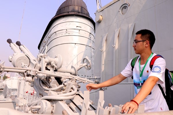 15时,实践队员们抵达海军博物馆北门,乘坐观光船进入海军博物馆。进入海军博物馆后,同学们首先观看了武器装备展区内的小型舰艇、飞机、237潜艇导弹、火炮、水中兵器、观通设备、水中坦克等七个陈列群;随后,同学们登上导弹护卫舰531鹰潭舰、海军首艘驱逐舰101鞍山舰以及导弹驱逐舰的首舰105济南舰进行参观。17时30分,实践队离开海军博物馆。