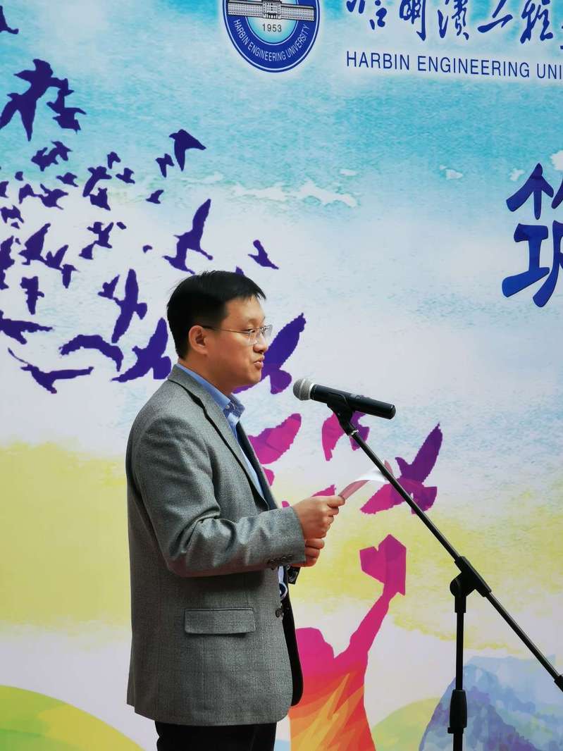 主持人陶哲在台上为同学们介绍本次活动的嘉宾。