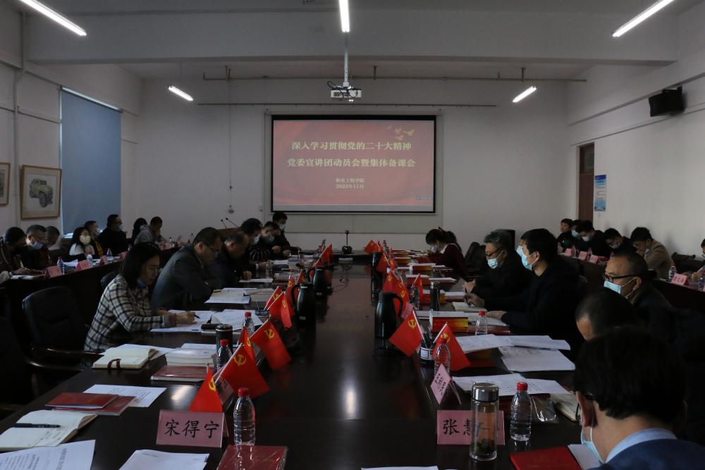 侯磊介绍学习贯彻党的二十大精神宣讲提纲和宣讲重点。侯磊指出,在宣讲过程要向全院师生讲清楚党的二十大的主题和主要成果,引导师生坚决拥护“两个确立”、坚决做到“两个维护”;要切实领会党的二十大精神的丰富内涵,着力讲深讲透党的创新理论,着重深刻领悟教育、科技、人才在实现第二个百年奋斗目标中的重大历史使命;要坚持以“双一流”建设为牵引,加快推进学校“十四五”规划落实落地,“五色”共谋办学治校,坚定不移走中国式现代化办学之路;要聚焦服务国家战略需求,结合学院实际,加快特色学科群建设,加快有组织的科研体系建设;要抢抓战略机遇,勇于变革、勇于创新,主动开辟新领域新赛道,不断塑造学院高质量发展新动能新优势。