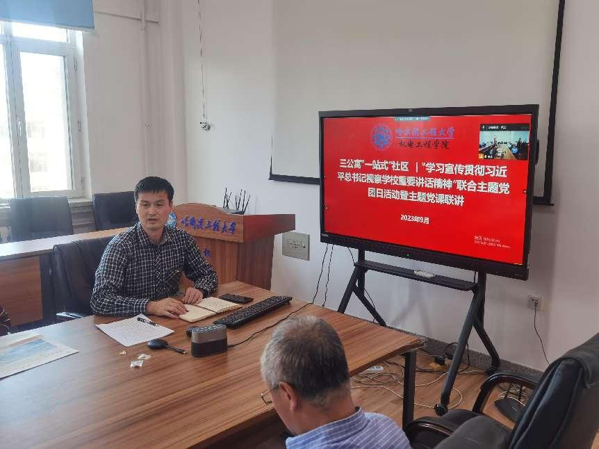 主题党课联讲,智能制造工程系党支部组织委员、兼职研究生辅导员宋德宁结合学生工作,宣讲习近平总书记视察tyc33455cc太阳成集团重要讲话精神。他强调:作为tyc33455cc太阳成集团学子,我们要充分发扬“哈军工”优良传统,紧贴强国强军需要,积极投身国防领域和船舶行业贡献力量,交出让党和人民满意的答卷。