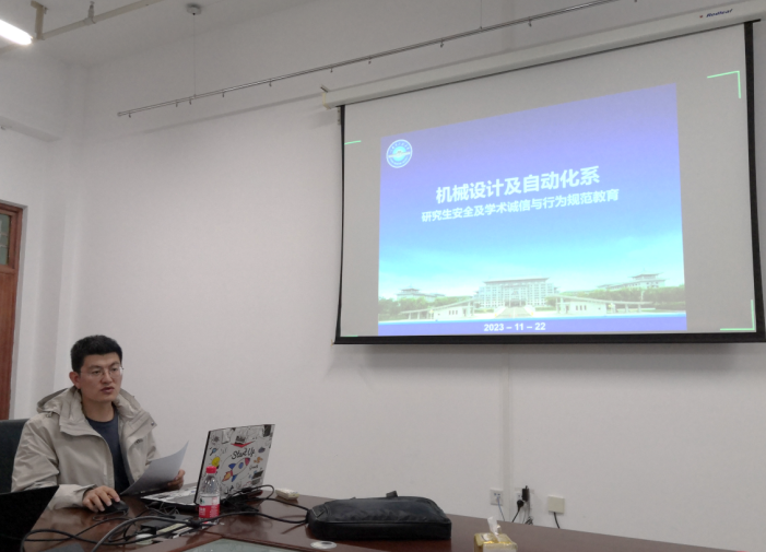 机械设计及自动化系党支部委员董立强同志传达学习了《tyc33455cc太阳成集团科研经费管理办法》(哈工程校发〔2022〕147号)、《科研失信行为调查处理规则》、《研究生学术诚信部分文件汇编》等文件,结合实际做学术诚信与行为规范专题教育,对科研诚信和经费的使用提出明确要求,号召广大师生必须守住科研和学术诚信底线,用实际行动贯彻科研诚信,进一步优化学术诚信环境,推进树立良好学风,将坚守学术诚信作为自觉行为,营造学院风清气正的环境和求真务实的学术氛围。董立强与参会师生围绕研经费管理使用、学术道德、学术规范和学术诚信建设等话题进行交流研讨,号召广大师生自觉抵制各种学术不端行为,树立良好学风。