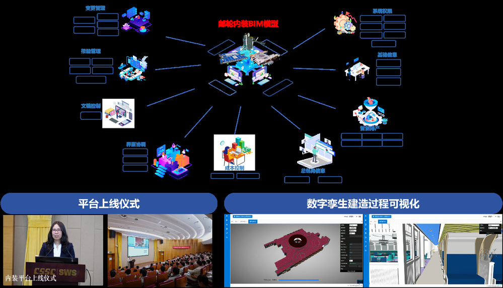 针对以大型邮轮为代表复杂巨系统工程制造过程由于离散度大、时间跨度长、多专业耦合性强引起的管理混乱顽疾,突破了跨平台多级计划逻辑推算、BIM模型数据重构、异构数据映射关联、推舱路径规划等多项核心关键技术,研发出内装数字孪生制造平台,于2021年成功上线应用,切实提高了国产首制大型邮轮建造效率。